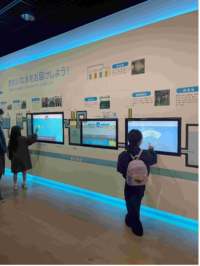 ガイダンス映像やドローン操作で水道水が家庭に届くまでのルートを探ったり、安全な水道水を作るまでのシステムをタイムアタックゲームで遊んだり、動きに合わせて動画が変わるインタラクティブシアターで水力発電に関することが学んだり、子どもも大人も楽しい仕掛けが盛りだくさんでした。