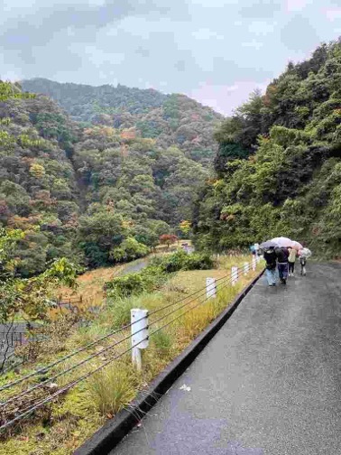当日の集合時間は午前10時。参加者たちが続々と神奈川県立あいかわ公園南駐車場に集まります。雨粒が葉を打つ音が静かに響くなか、参加者同士が挨拶を交わし、傘を片手に見学会がスタート。まずは最初の目的地である石小屋ダムへ向かいました。